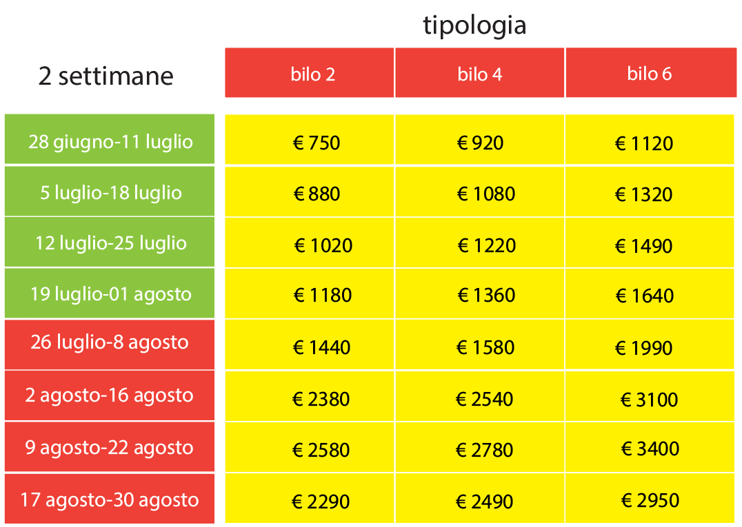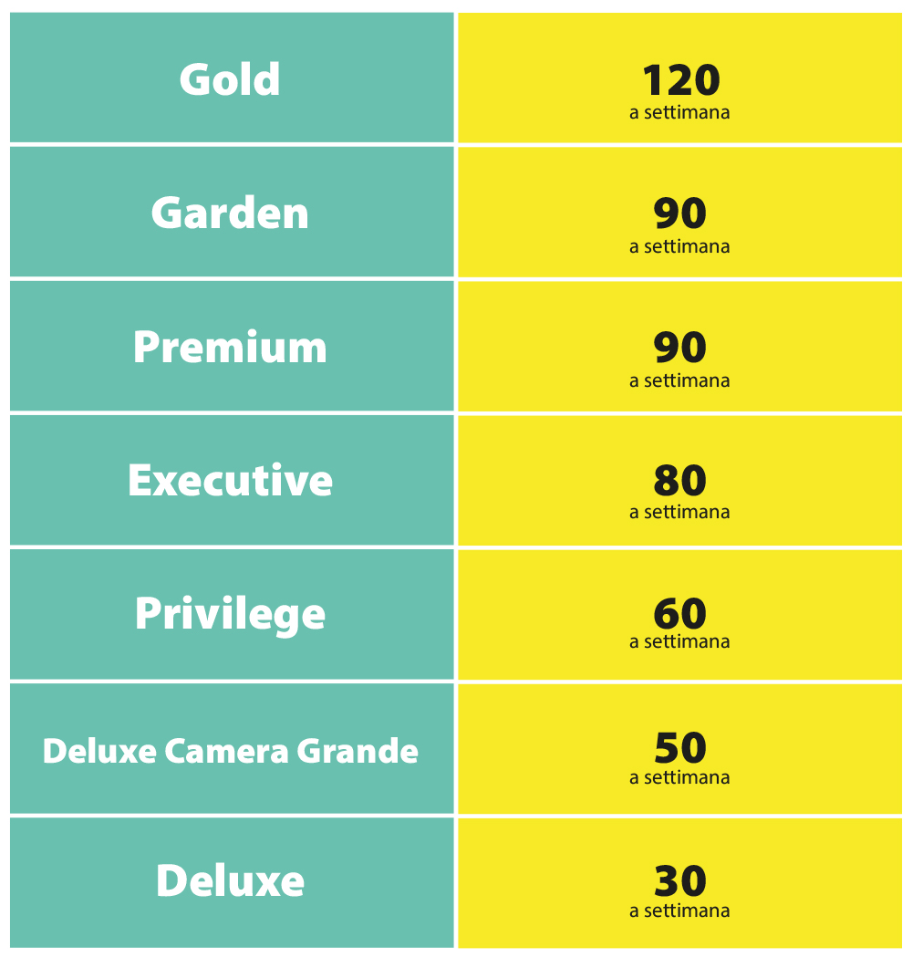 - tassa di soggiorno 2€ al giorno a persona, 0-13 anni gratuita